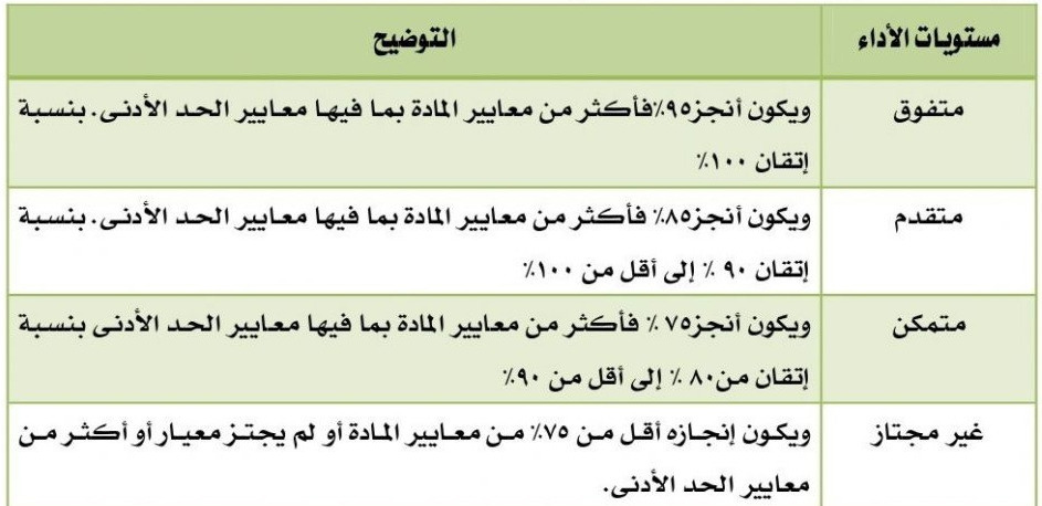 اذا تم تصنيف الطالب على أنه “متقدم” في نظام نور فهذا يشير إلى تحقيقه لمستوى عالٍ من التفوق والفهم في مواده الدراسية، حيث يحصل الطالب على هذا التصنيف عندما ينجز 85% أو أكثر من معايير المادة، بما في ذلك معايير الحد الأدنى بنسبة إتقان تتراوح من 90% إلى أقل من 100%.