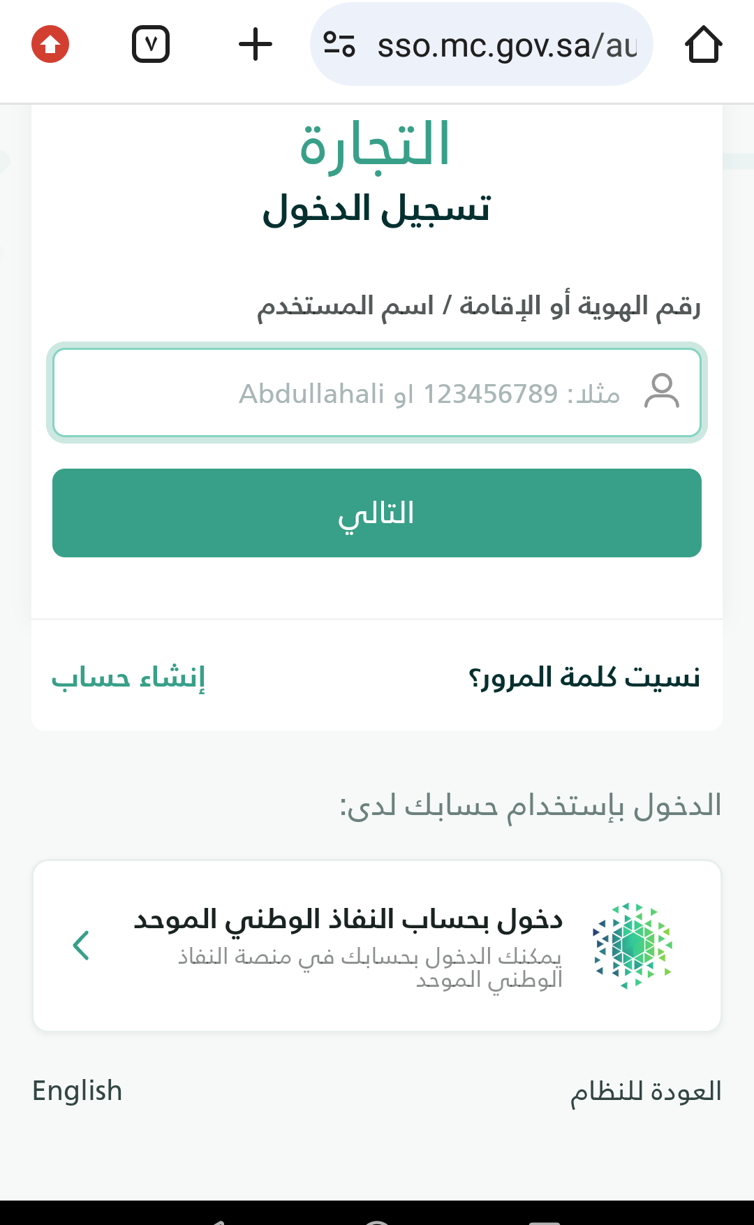 النقر على أيقونة التالي. - أو يمكن الدخول عبر النفاذ الوطني الموحد، وإدخال رقم الهوية الوطنية.