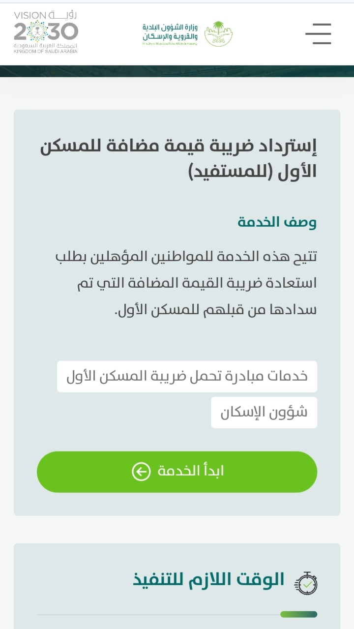 إن خدمة استردَاد ضريبة القيمة المضافة للمسكن الأول هي عبارة عن خدمة إلكترونية أتاحتها وزارة الشؤون البلدية والقروية والإسكان في المملكة العربية السعودية للمواطنين فيها، ووضعتها ضمن خدمات مبادرة تحمل الضريبة المضافة الموجودة في شؤون الإسكان، بهدف مساعدة المواطنين المؤهلين على تقديم طلب استعادة ضريبة القيمة المضافة التي قاموا بسدادها للمسكن الأول.