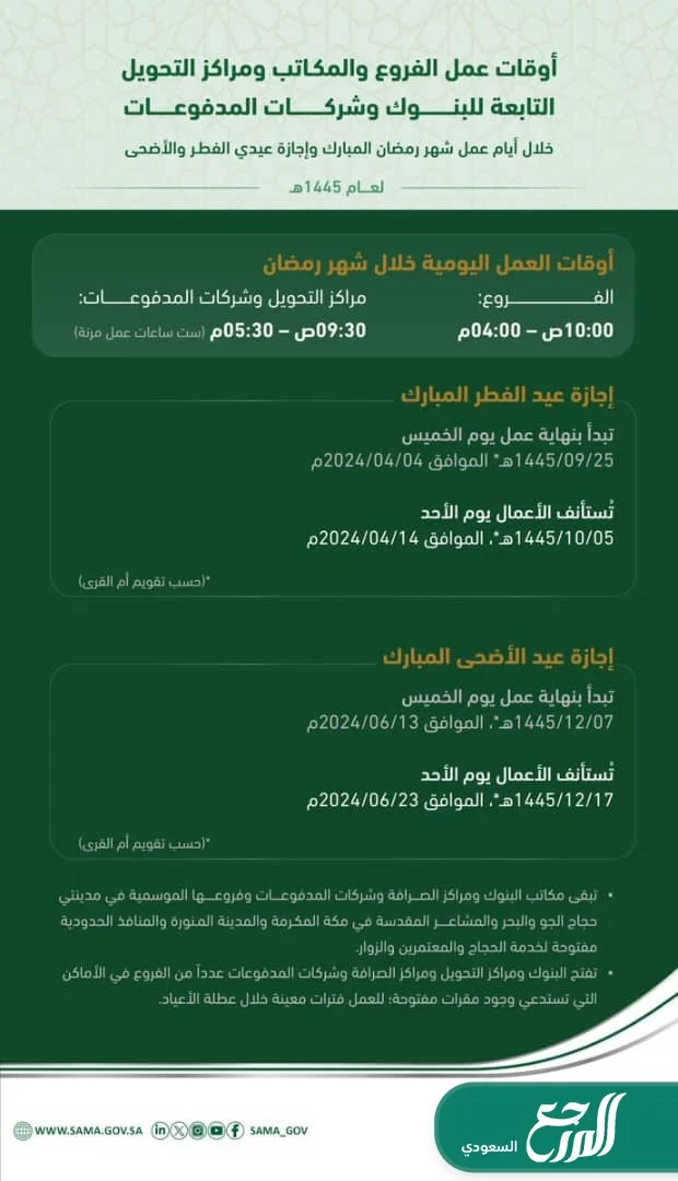 ينتهيَ دوَام البنْوك في رمضان في تمام الساعة الرابعة عصرًا، وذلك بالفروع الخاصة بأي من البنْوك الموجودة داخل المملكة والتي يبدأ العمل بها من الساعة العاشرة صباحًا، حيثُ يستمر استقبال المُراجعين لإتمام خدماتهم لمدة ست ساعات يوميًا، بينما ينتهيّ دوَام مراكز التحويل وشركات المدفوعات في في الساعة الخامسة والنصف مساءً، حيثُ تعمل تلك المراكز لمدة ست ساعات عمل مرنة يوميًا بدايةً من الساعة التاسعة والنصف صباحًا. [1]
