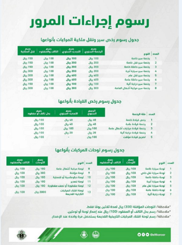 | رخصة سير مركبة أشغال عامة | 300 ريال |