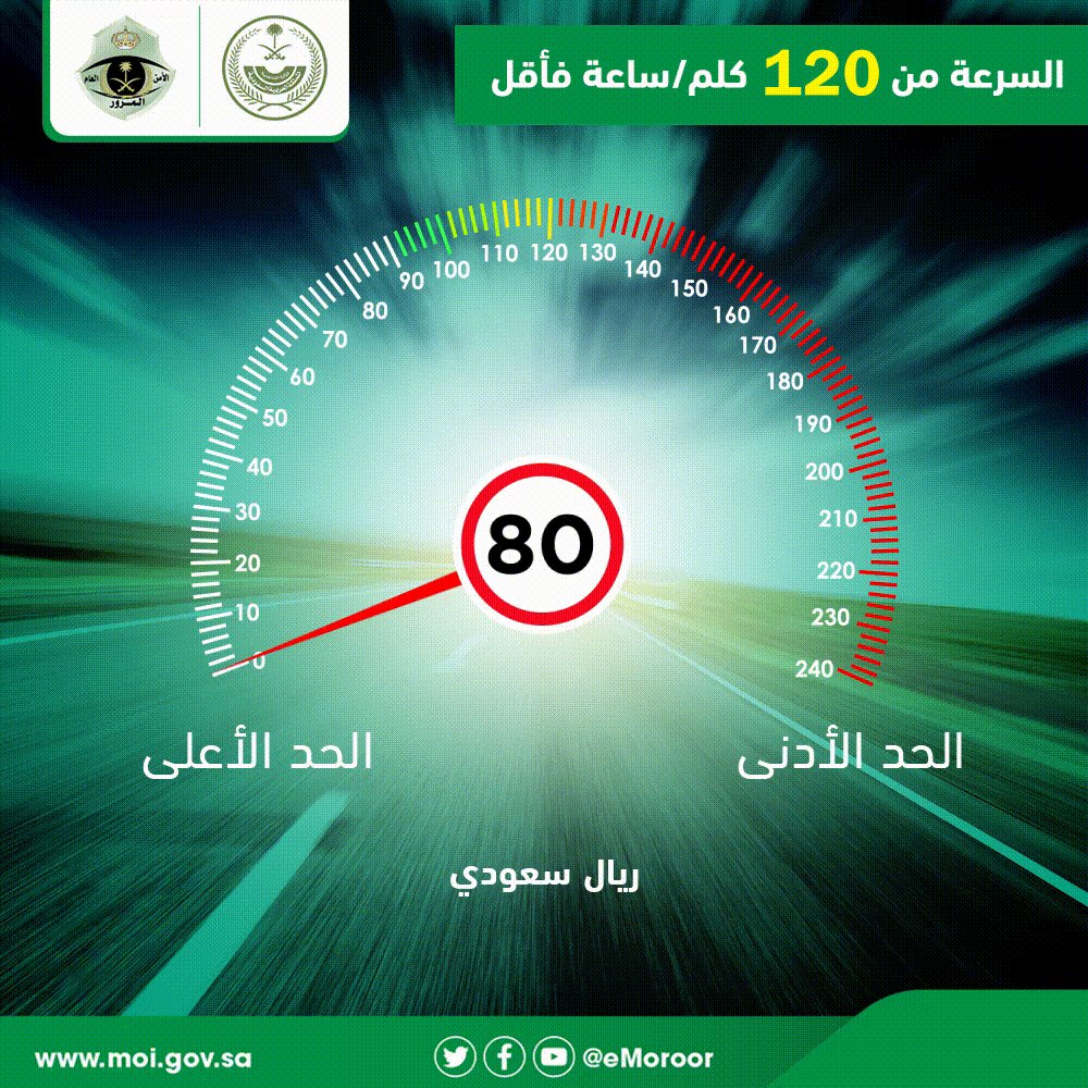 - تجاوز السرعة 120 بمقدار 30 كم إلى 40 كم/س هو: 800 ريال سعودي حد أدنى، و1000 ريال سعودي حد أعلى.